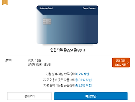 전체 글 (1) 썸네일형 리스트형 신한 딥드림카드 (Deep dream) 혜택 정보 신한 딥드림카드이란?신한카드에서 출시된 딥드림 (Deep Dream) 카드는 신한카드가 옛날의 LG카드와 통합 한지 10주년을 맞이하여 출시한 신용카드입니다. 신한 딥드림카드 혜택이 카드는 다른 카드와는 달리 전월 실적에 상관없이 모든 가맹점에서 0.7%가 적립된다는 특징이 있습니다. 만약 전월 이용실적이 30만원 이상이면서, 5가지 업종(드림영역)에서 사용시 추가로 적립되어 총 2.1~3.5%가 마이신한 포인트로 적립됩니다. * 드림영역 - 할인점, 편의점&잡화, 영화&커피, 해외, 이동통신요금 포인트 적립 외에도 전월실적이 30만원 이상인 경우, 주말에 주유소 이용시 리터당 80원이 적립되며, 택시 할인도 혜택도 있습니다. 신한 딥드림카드 적립 상세딥드림카드는 기본적립(모두드림, 0.7%)과 추가적립.. 이전 1 다음